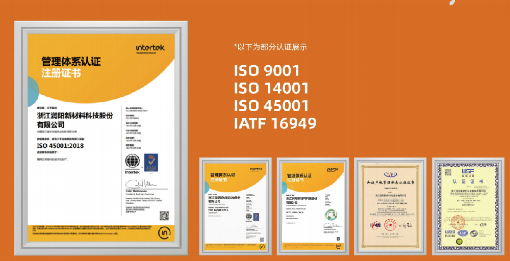始终严格把控产品质量的润阳科技在近十年的耕耘下,也交出了一份高质量的发展答卷。在标准化管理方面,润阳科技达到了国家标准,并正式获得ISO:9001、ISO:14001、ISO:45001、IATF:16949等体系认证;在产品质量方面,润阳科技凭借高质量技术和专业工艺流程,赋予产品更多样化的性能,能够满足各行业客户的高标准要求。